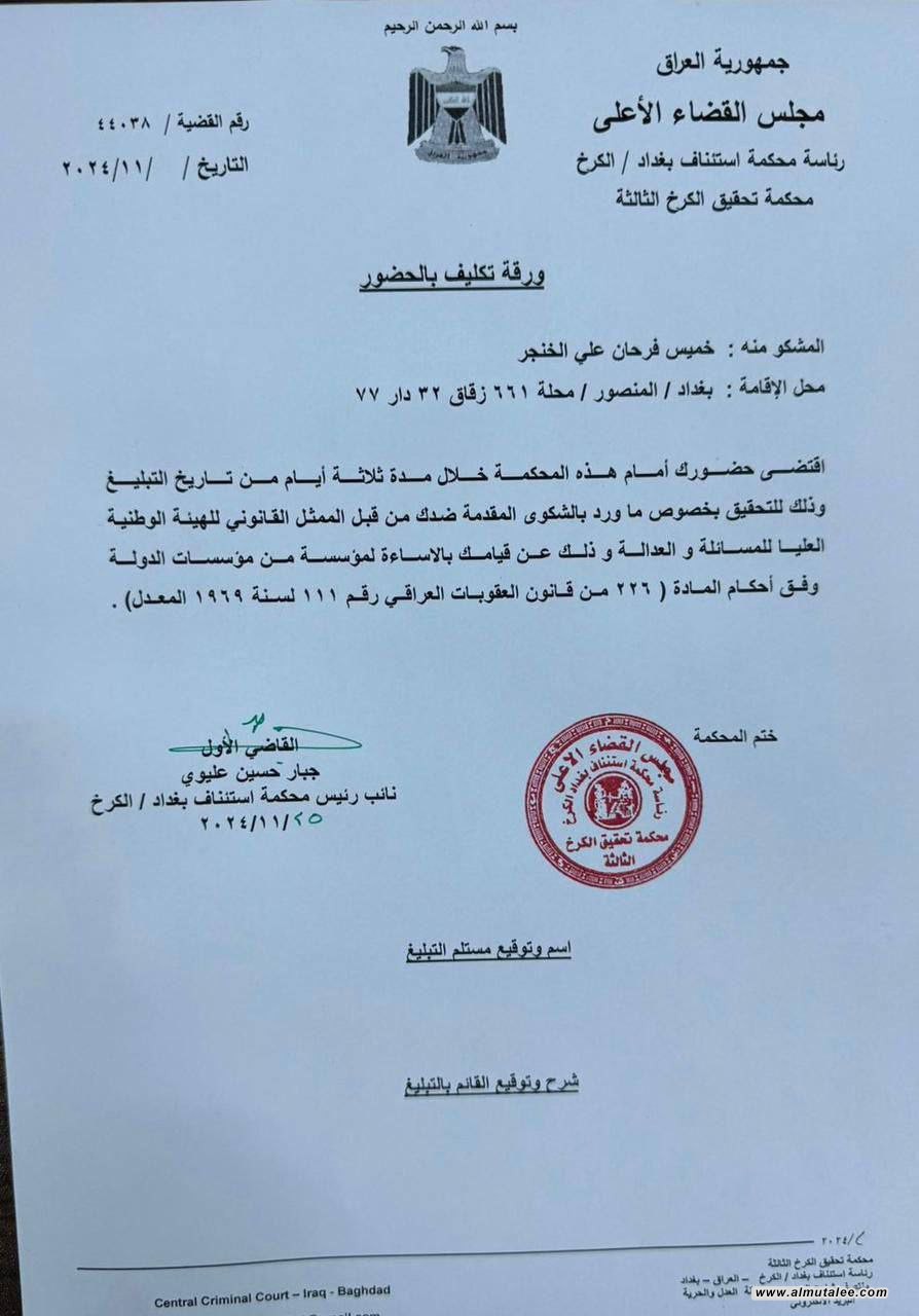 أظهرت وثيقة صادرة عن محكمة تحقيق الكرخ الثالثة استقدام رئيس تحالف السيادة الشيخ خميس الخنجر للتحقيق معه بخصوص ما ورد بالشكوى المقدمة من قبل المساءلة والعدالة.