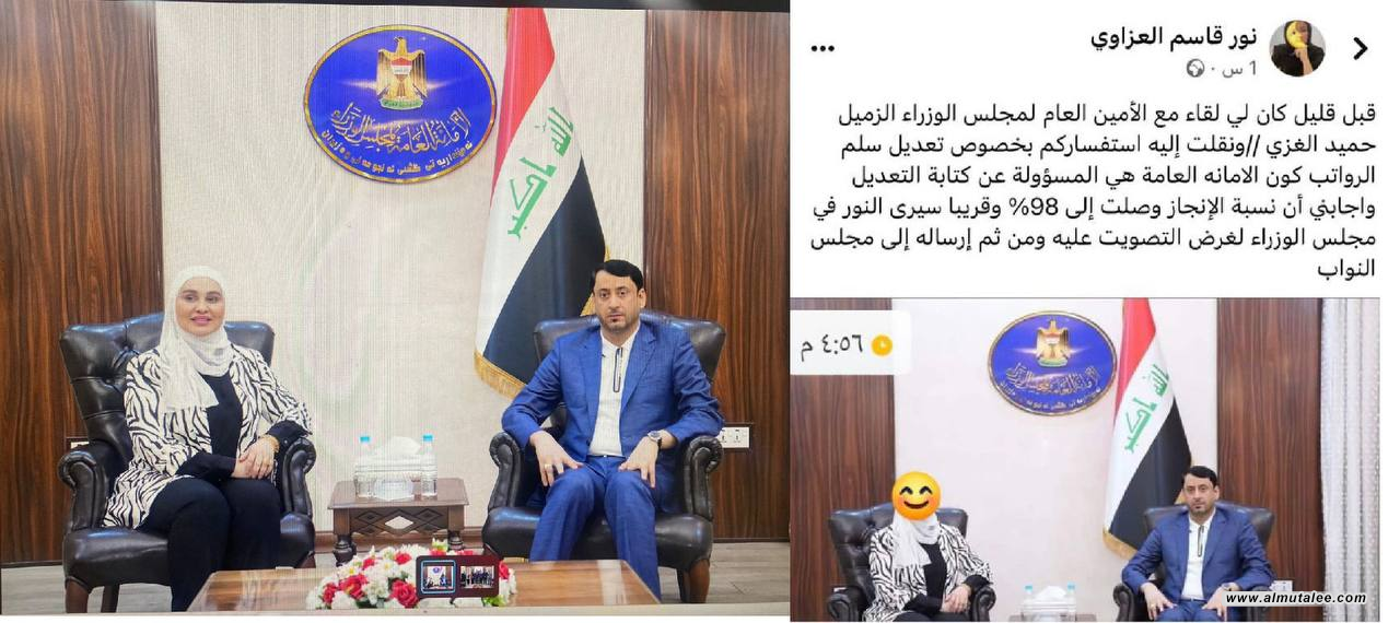 نفت الأمانة العامة لمجلس الوزراء، اليوم الأحد، صلتها بالمدعوة (نور قاسم العزاوي)، بعد نشر الأخيرة "صورة مفبركة" مع الأمين العام حميد الغزي.