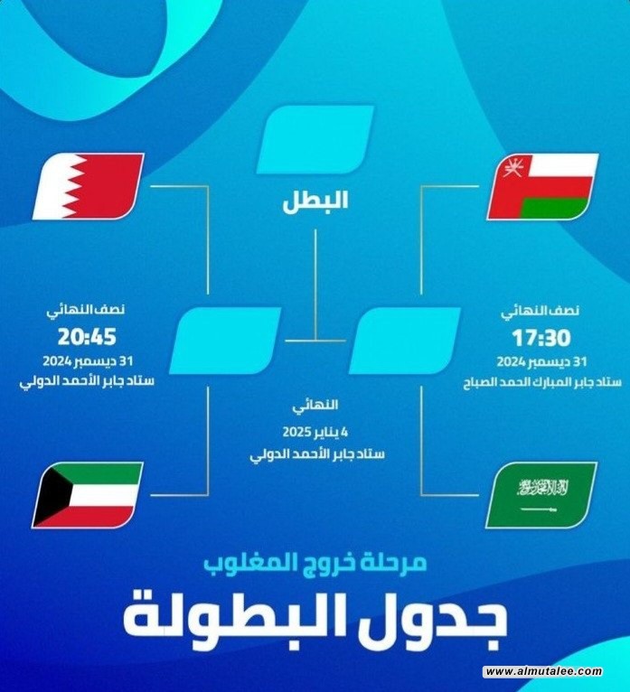 وذكر الموقع الرسمي للبطولة، في بيان تلقته وكالة "المطلع"، أن:"الاتحاد الخليجي لكرة القدم، قرر تأجيل المباراة النهائية لبطولة كأس الخليج ليوم واحد لتقام في الرابع من كانون الثاني المقبل، مع إبقاء مواجهتي نصف النهائي في الموعد المحدد مسبقاً يوم الثلاثاء المقبل".
