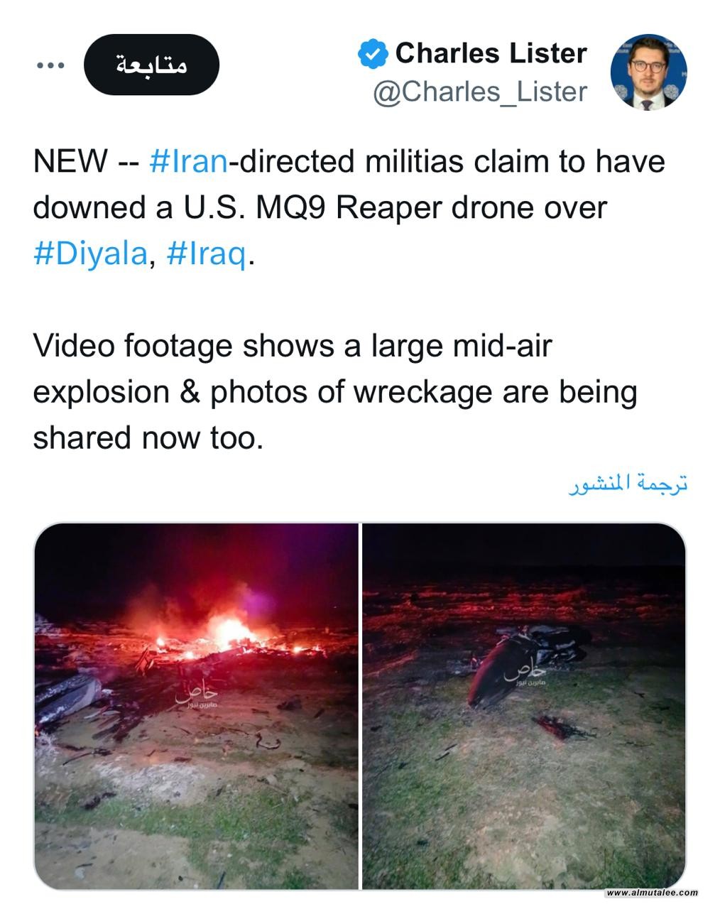 كشفت وسائل أعلام أمريكية، تفاصيل أسقاط طائرة أمريكية مسيّرة من طراز MQ9 ليلة أمس الخميس في محافظة ديالى العراقية، فيما بينت انه هذه الحادثة تعتبر الثانية منذ أوائل تشرين الثاني/ نوفمبر 2023. وقال مراسل شبكة "فوكس نيوز" الأميركية، لوكاس توملينسون، في تغريدة على موقع "إكس - تويتر سابقاً"، ان "الفصائل المسلحة أسقطت طائرة أمريكية مسيّرة من طراز MQ9 ليلة الخميس في محافظة ديالى العراقية"، مشيرا الى ان "هذه الحادثة تعتبر الثانية منذ أوائل تشرين الثاني/ نوفمبر 2023". وهذه المسيرة هي طائرة أمريكية بدون طيار من طراز MQ9 بقيمة 32 مليون دولار في العراق، بحسب لوكاس توملينسون.