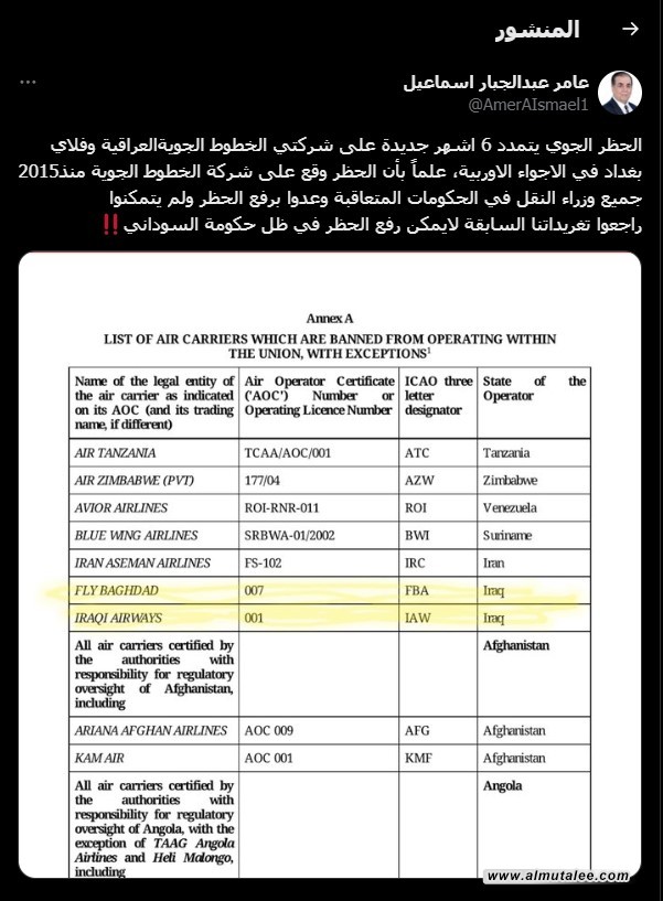 وقال عبد الجبار، في تدوينة على أكس ،تابعته المطلع، إن “الحظر الجوي يتمدد 6 اشهر جديدة على شركتي الخطوط الجوية العراقية وفلاي بغداد في الأجواء الاوربية”.