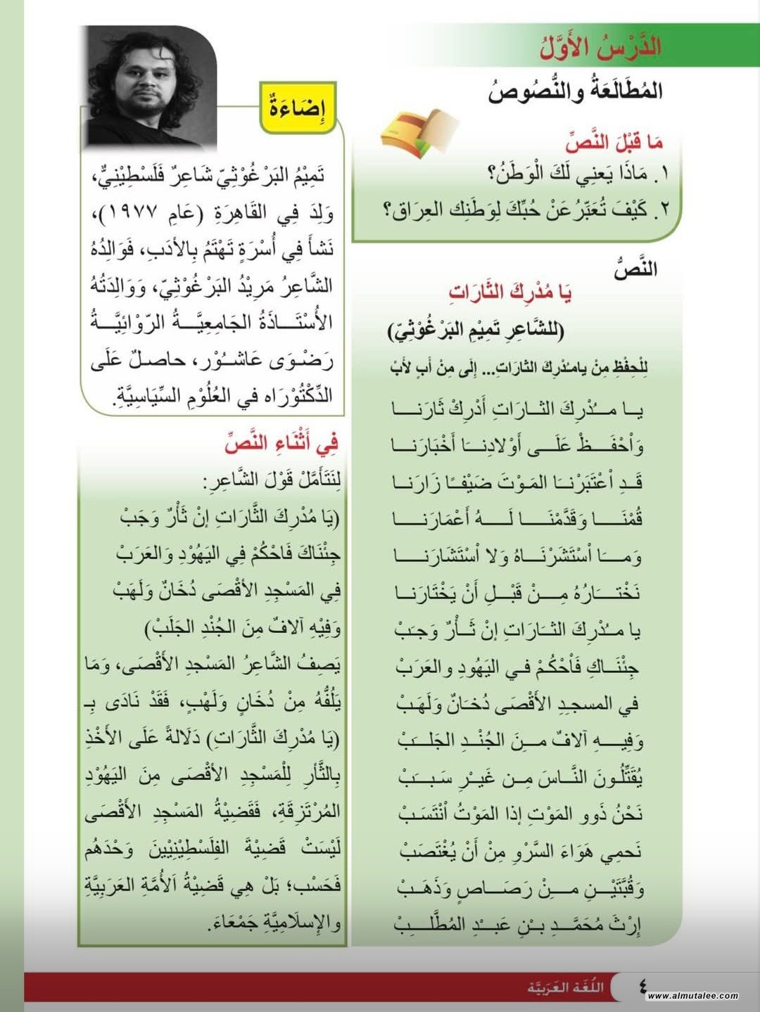 في لفتة تعكس عراقة العلاقات الثقافية بين العراق وفلسطين، أعرب الشاعر الفلسطيني "تميم البرغوثي" عن شكره العميق للعراق على تضمين قصيدته في المنهاج الدراسي لمادة اللغة العربية للصف الثاني المتوسط.