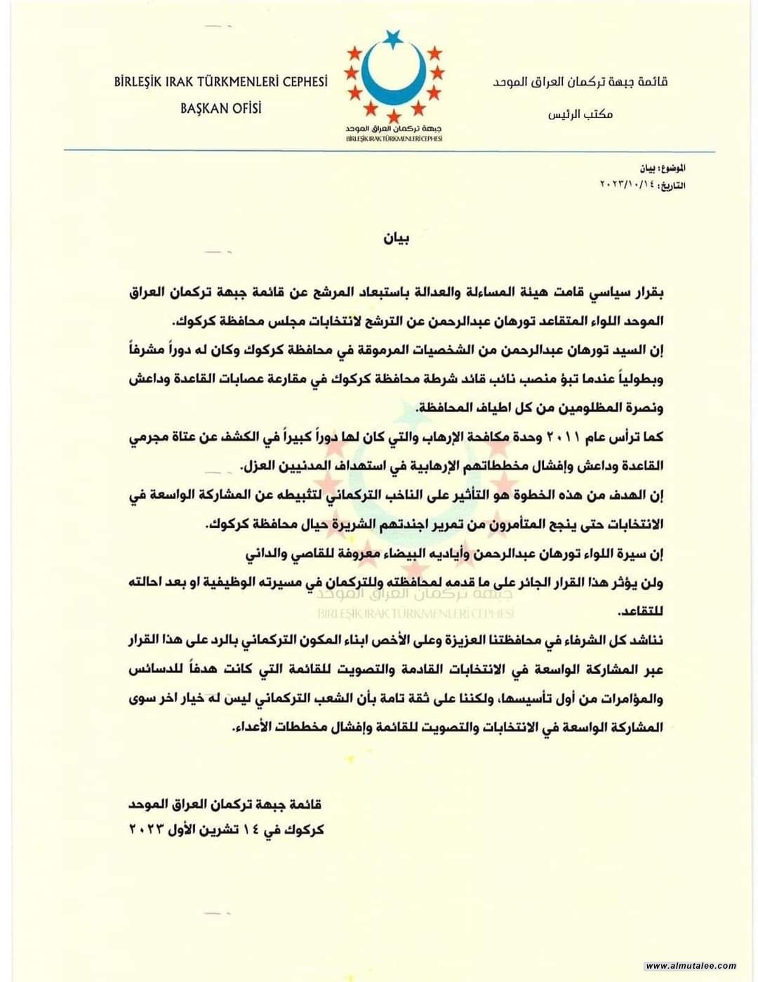 أصدرت قائمة جبهة تركمان العراق الموحد، اليوم السبت، بياناً غاضباً بشأن استبعاد أحد أعضائها من الترشح للانتخابات المحلية.