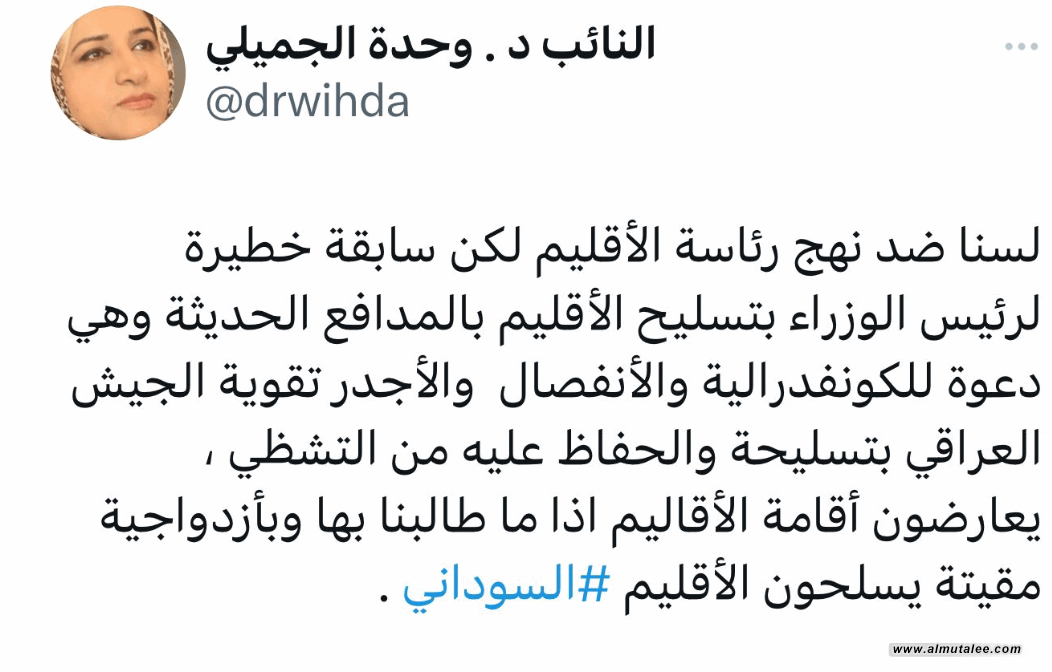 وقالت الجميلي؛ في تغريدةٍ لها تابعتها "المطلع"، انه:"لسنا ضد نهج رئاسة الإقليم؛ لكن سابقة خطيرة لرئيس الوزراء بتسليح الإقليم بالمدافع الحديثة، وهي دعوة للكونفيدرالية والانفصال"، مشيرة إلى أن:"الأجدر هو تقوية الجيش العراقي بتسليحه والحفاظ عليه من التشظي".