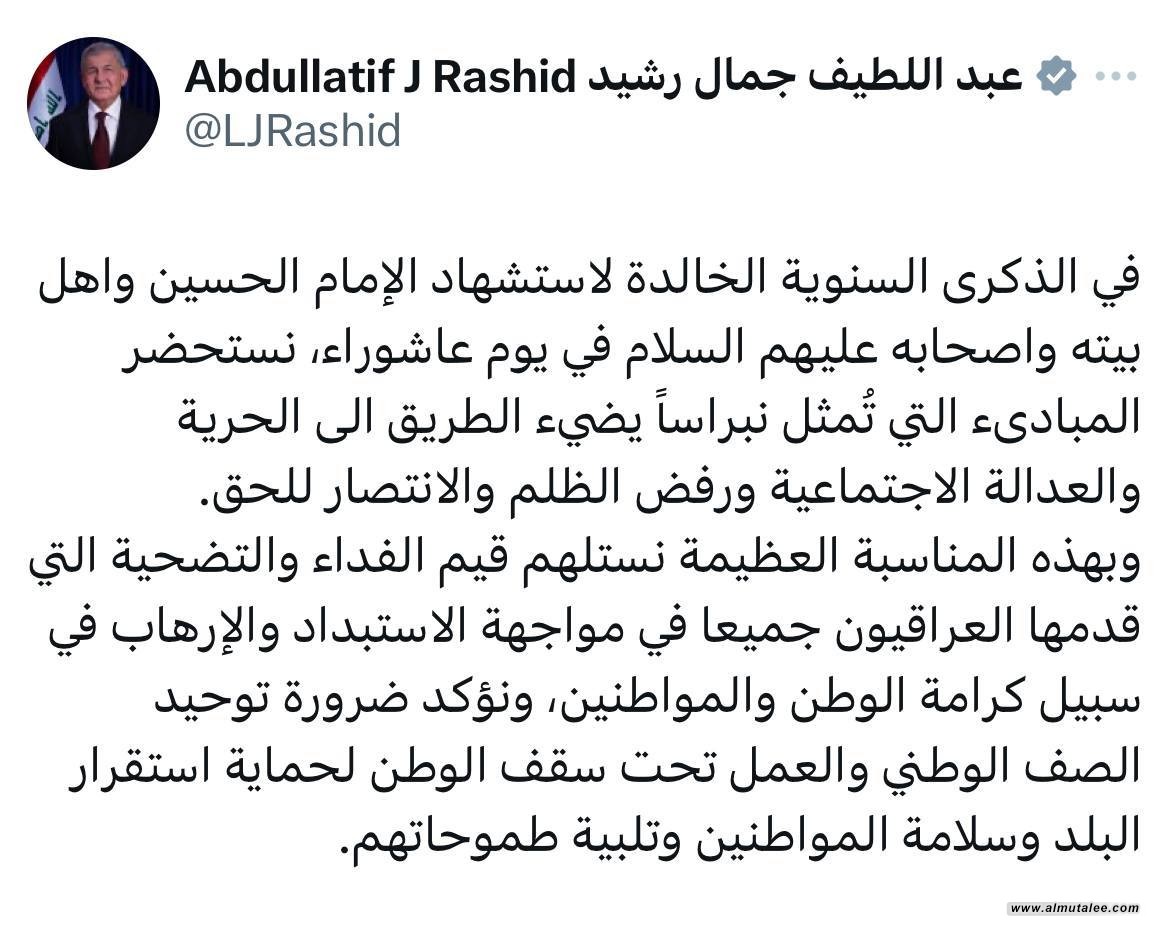 رئيس الجمهورية في ذكرى عاشوراء: نستلهم قيم الفداء والتضحية التي قدمها العراقيون جميعا
