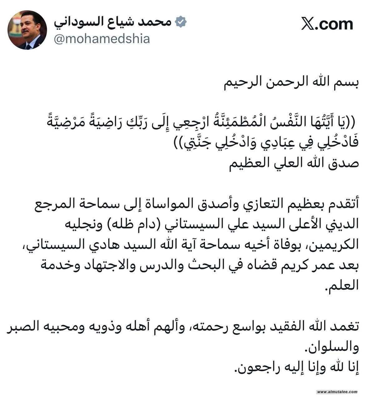 وقال رئيس الوزراء في بيان بحسب مكتبه الإعلامي وتلقته وكالة المطلع، إنه:"أتقدم بعظيم التعازي وأصدق المواساة إلى سماحة المرجع الديني الأعلى السيد علي السيستاني (دام ظله) ونجليه الكريمين، بوفاة أخيه سماحة آية الله السيد هادي السيستاني، بعد عمر كريم قضاه في البحث والدرس والاجتهاد وخدمة العلم".
