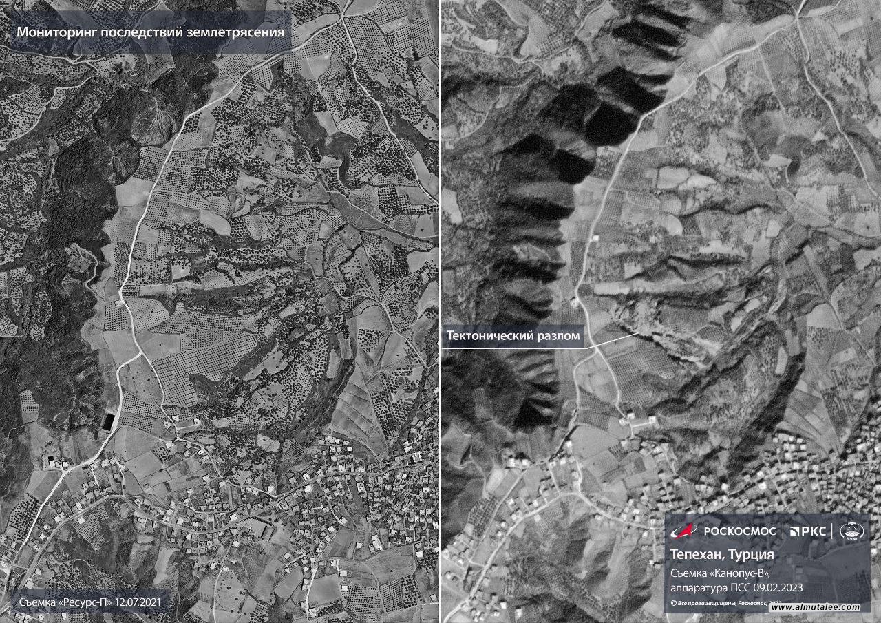 أشار بيان وكالة الفضاء الروسية، (12 شباط 2023)، إلى أن صور القمر الصناعي "Kanopus-B" شملت منطقة جنوب شرقي تركيا، وتظهر حجم التغير في الصفائح التكتونية بقرية تبه هان بولاية هطاي التركية.