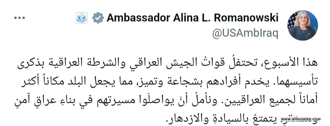 وكتبت السفيرة في تغريدة عبر منصة (إكس) تابعتها "المطلع"، أن: "هذا الأسبوع، تحتفلُ قواتُ الجيش العراقي والشرطة العراقية بذكرى تأسيسهما يخدم أفرادهم بشجاعة وتميز، مما يجعل البلد مكاناً أكثر أماناً لجميع العراقيين".
