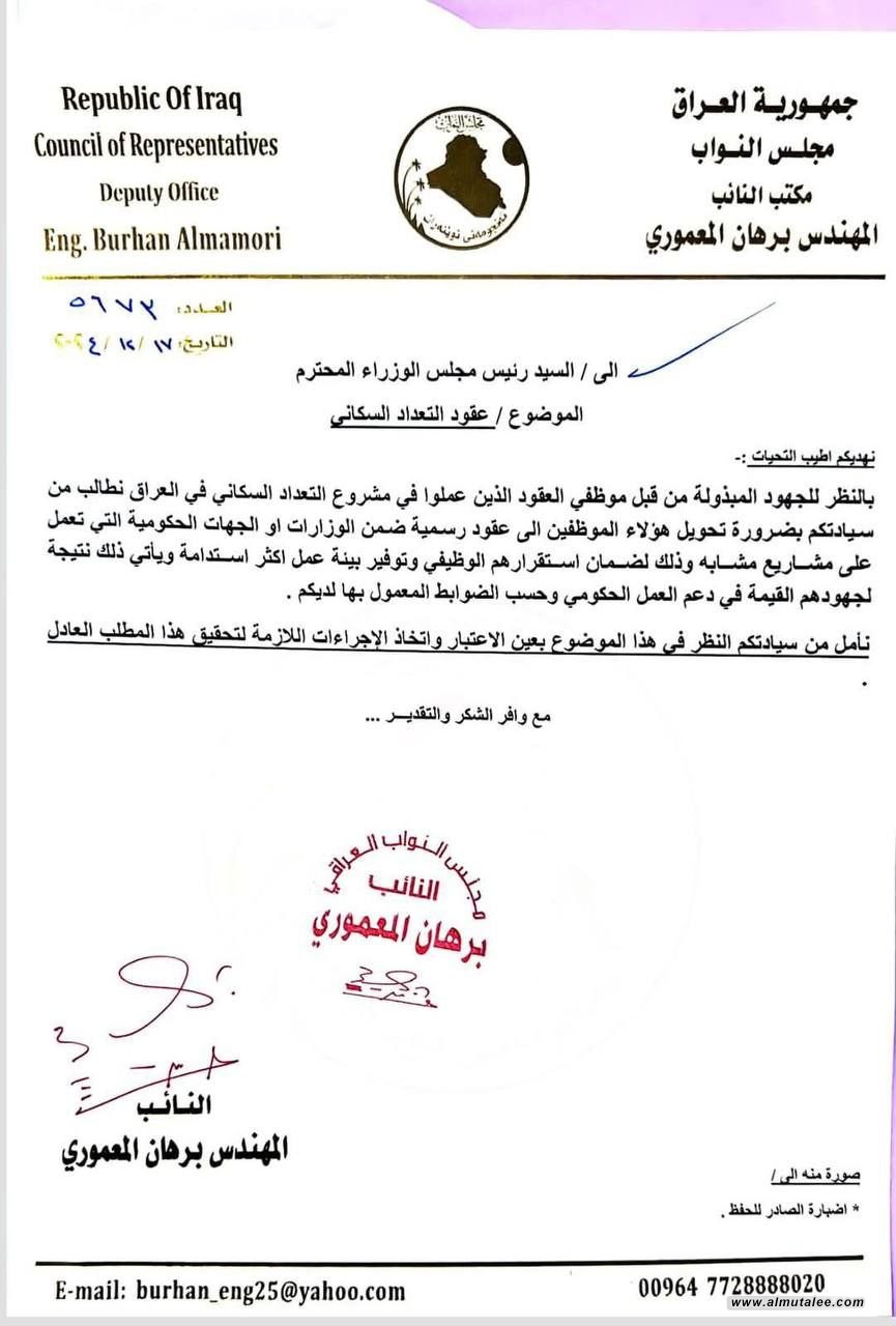 طالب النائب برهان المعموري، اليوم الثلاثاء، رئيس مجلس الوزراء بتحويل عقود التعداد السكاني إلى عقود رسمية.