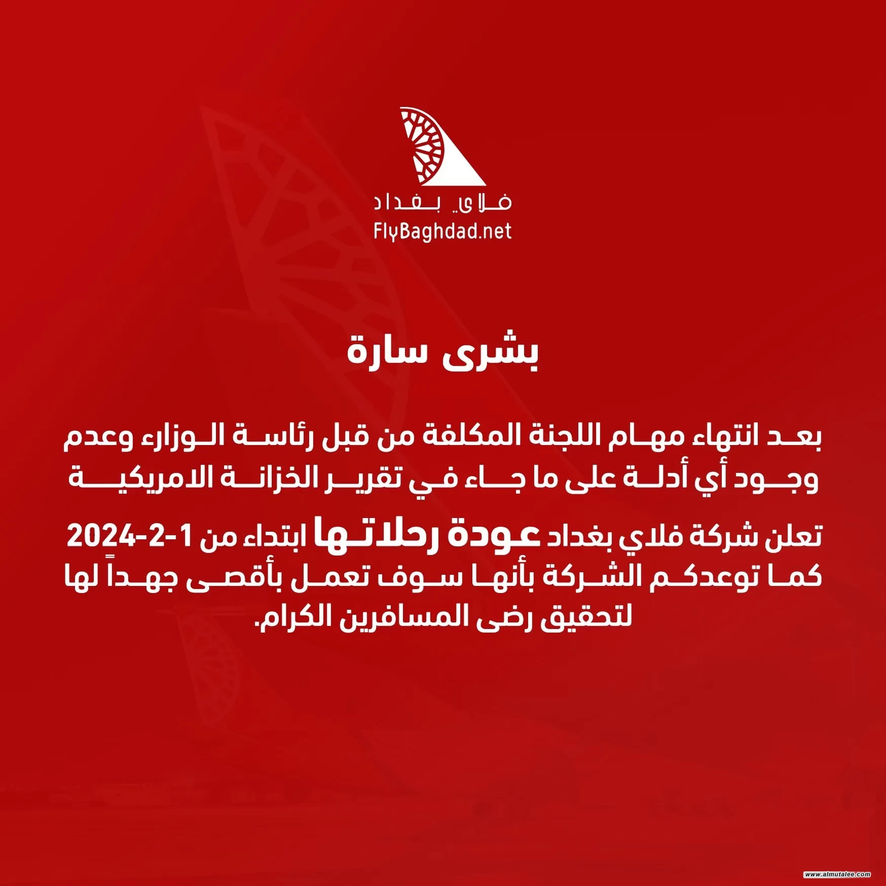 فلاي بغداد تعلن عن عودة رحلاتها ابتداء من مطلع شباط المقبل