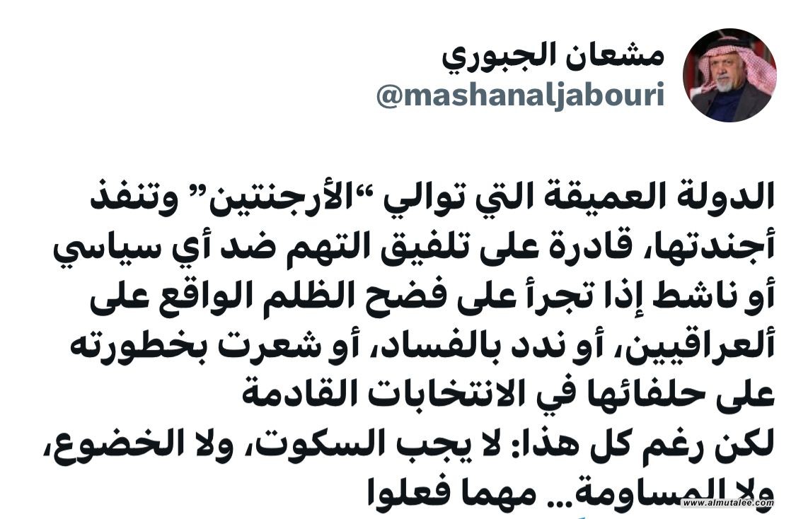 وقال الجبوري، في تغريدة عبر حسابه الرسمي على منصة "إكس"، تلقتها المطلع، إن:"الدولة العميقة التي توالي الأرجنتين وتنفذ أجندتها قادرة على تلفيق التهم ضد أي شخص يتحدث عن الفساد أو يكشف التجاوزات، أو حتى يشكل خطرًا على حلفائها في الانتخابات المقبلة".