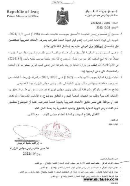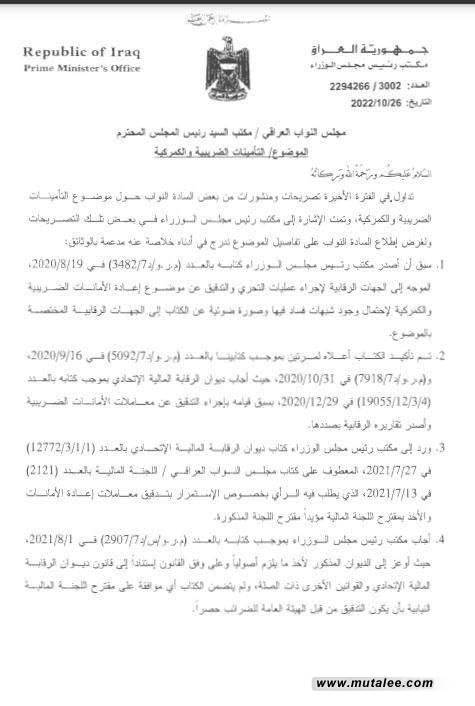 مكتب الكاظمي ينفي إبلاغه من وزير المالية الأسبق بسرقة الأمانات الضريبية