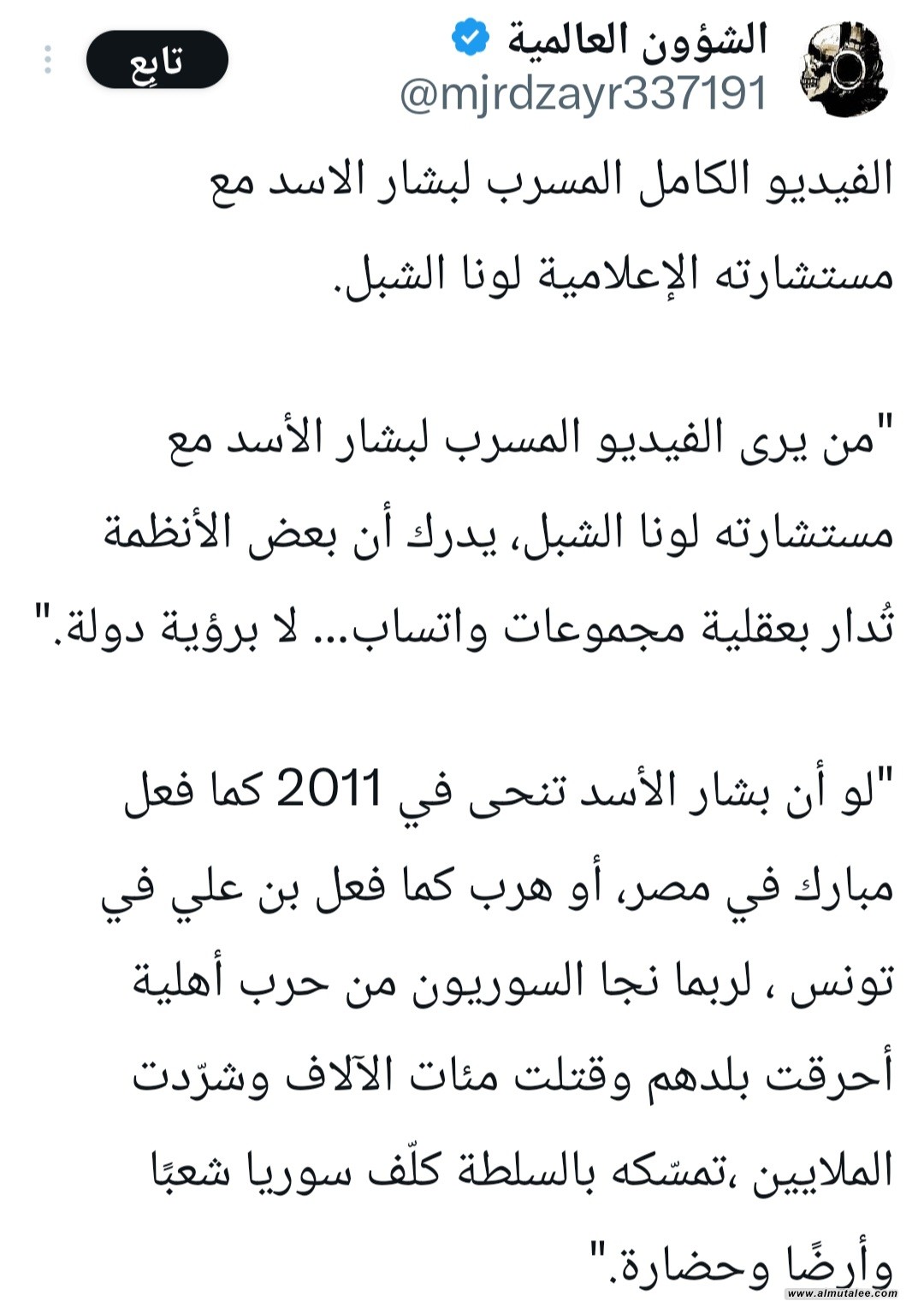 أثارت تسريبات لحوار قديم بين الرئيس السوري السابق بشار الأسد ومستشارته الإعلامية لونا الشبل جدلاً واسعاً على مواقع التواصل الاجتماعي، خصوصاً على منصة "إكس"، حيث تجاوزت مشاهداتها المليون خلال ساعات قليلة، وكانت قناة "العربية" نشرت المقاطع أولاً.