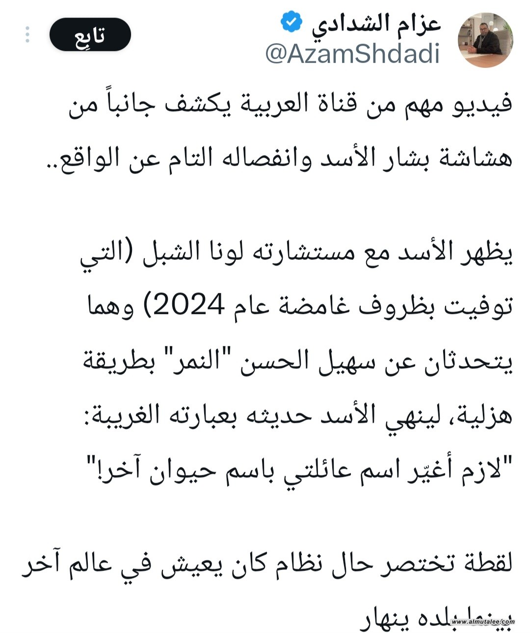 واختتم قائلا: “لذلك، ما دار بين الأسد ولونا يبقى مجرد حوار جانبي، والشواهد على ذلك كثيرة، منها الوثائق التي تكشف تورط توم برّاك في فضائح إبستين الجنسية وفساد سياسيين ورياضيين وإعلاميين ..الخ”.
