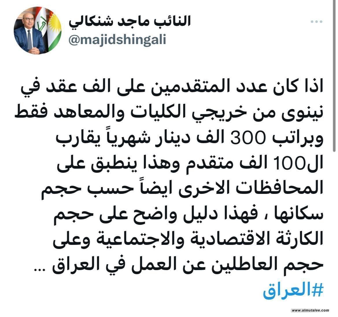 وقال شنكالي في تغريدة "اذا كان عدد المتقدمين على الف عقد في نينوى من خريجي الكليات والمعاهد فقط وبراتب 300 الف دينار شهرياً يقارب ال100 الف متقدم وهذا ينطبق على المحافظات الاخرى ايضاً حسب حجم سكانها".