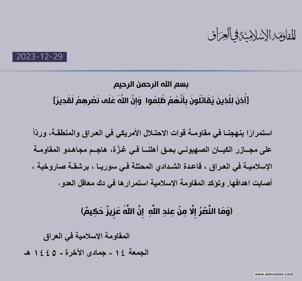 وقالت الفصائل، في بيان تلقته “المطلع” إنه: “استمرارا بنهجنا في مقاومة القوات الأمريكية في العراق والمنطقة، وردّاً على مجازر الجيش الإسرائيلي بحق أهلنا في غزّة، هاجم مجاهدينا في العراق، قاعدة الشدادي المحتلة في سوريا برشقة صاروخية أصابت اهدافها”.