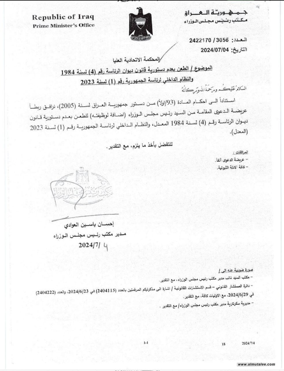 وثيقة: السوداني يقيم دعوى للحكم بعدم دستورية النظام الداخلي لرئاسة الجمهورية وقانون ديوانها