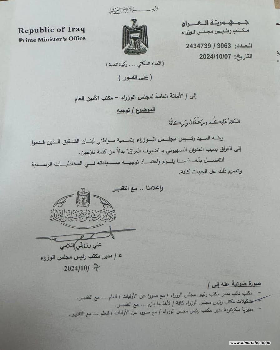 وثيقة..توجيه حكومي بتسمية اللبنانيين القادمين للعراق بـ”الضيوف” بدل “نازحين”