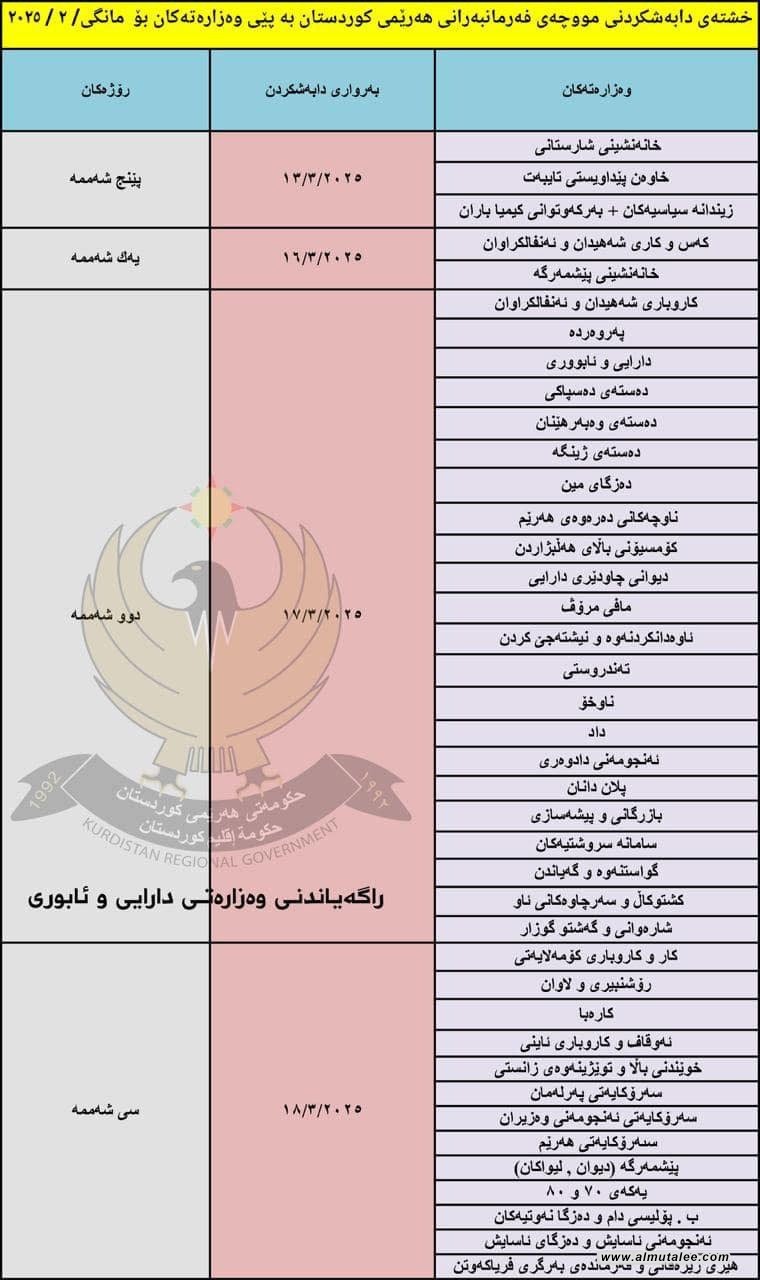 بەگوێرەی خشتەکە، دابەشکردنی مووچەی فەرمانبەران و مووچەخۆرانی هەرێم لە ڕۆژی پێنجشەممە 13ـی ئادار تاوەکو سێشەممەی هەفتەی داهاتوو 18ی ئاداری بەردەوام بێت.