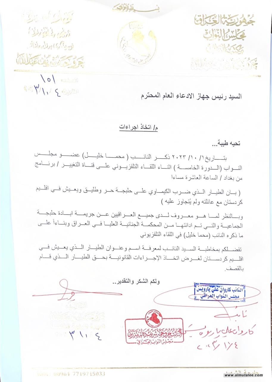 وبحسب الوثيقة فأن "النائبين عن كتلة الاتحاد الوطني الكردستاني جرو حمه شريف وكاروان يارويس خاطبا رئيس جهاز الادعاء العام للتأكد من اسم وعنوان الطيار لغرض اتخاذ الاجراءات القانونية بحقه".