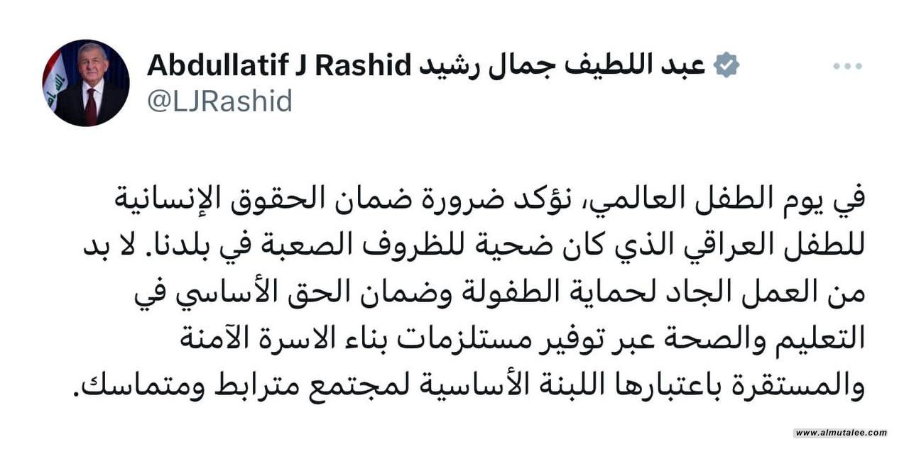 سەرۆک کۆمار لە پلاتفۆرمی ئێکس رایگەیاند:"لە ڕۆژی جیهانی منداڵاندا، ئێمە جەخت دەکەینەوە لەسەر پێویستی زامنکردنی مافەکانی مرۆڤی بۆ منداڵانی عێراق کە بوونەتە قوربانی بارودۆخی سەختی وڵاتەکەمان". وتیشى”پێویستە بە جدى کار بکرێت بۆ پاراستنی منداڵان و دڵنیابوون لە مافی بنەڕەتی بۆ پەروەردە و تەندروستی لە ڕێگەی دابینکردنی پێداویستییەکان بۆ بنیاتنانی خێزانێکی سەلامەت و جێگیر كه بەردی بناغەی بنیاتنانی کۆمەڵگایەکی یەکگرتووه“.